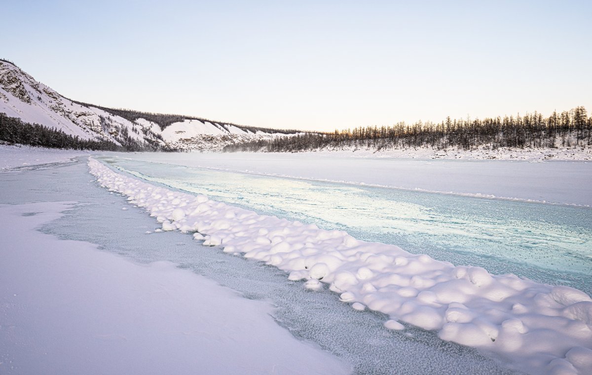 Традиционная забава - выйти на зимник Индигир и пройти "Индигирскую трубу" = 20-километровое ущелье, которое прорезает хребет Черского с юга на север: Нулевой километр автозимника "Индигир": Ледяной "пупырь", который мы впервые видели в 2024м - снова на месте! Но в этот раз он просто треснул, а не взорвался с разбросом многотонных "ледышек" метров на 100 в разные стороны... (см. фотки по ссылке выше). Едем дальше - до "Трубы" аж 180 вот таких километров: "Труба" - уже рассказывал и показывал, но всё равно хочется сюда возвращаться. Тем более, что каждый раз картинки здесь показывают разные. Река промерзает до самого дна, лёд прозрачнейший - и местами дно видно сквозь его толщу: А иногда камни просто висят в толще льда: Вот такая здесь суперсверхтяжёлая вода... А дальше мы попали в так называемые "наледи" - выходы жидкой воды, которая заливает лёд реки, автозимник и блокирует автодвижение: При этом уровень воды быстро поднимается, что ставит под большой риск наши планы... Пришлось "ломиться по-мокрому": Вот такая здесь бывает водная стихия. Причём иногда в минус-50-градусные морозы (см. мои рассказы из 2024 - ссылка выше).2 балла