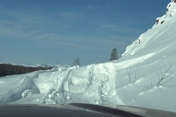 Неужели про "1111" нет никаких идей?... Ну, тогда очередная порция интересных фоток, добытых по дороге. Например, какие тут названия! Перевал "Гаврюшка" Виды с перевала роскошны! Белый зимний мир... Вот они мы в полном составе: Заодно заглянули во второй вход в Староколымский тракт. Там первые примерно 40 км расчищены - где-то там в стороне какой-то работающий прииск (золото?), туда и чистят дорогу. Местами хорошие "прижимы", в некоторых местах над обрывом нет снежнего бруствера... Бодрит! Потом расчищенная дорога кончается, дальше кто-то (рыбаки?) протоптали колею на Трэколе: Но практически сразу дорога оказалась перекрыта сошедшей со скал лавиной, пролезть не получилось... Начали искать обходные пути по реке (тоже по следу Трэкола) - И вдруг - опаньки... Попытка пролезть через воду тоже не очень получилась, зато повеселились от души!3 балла