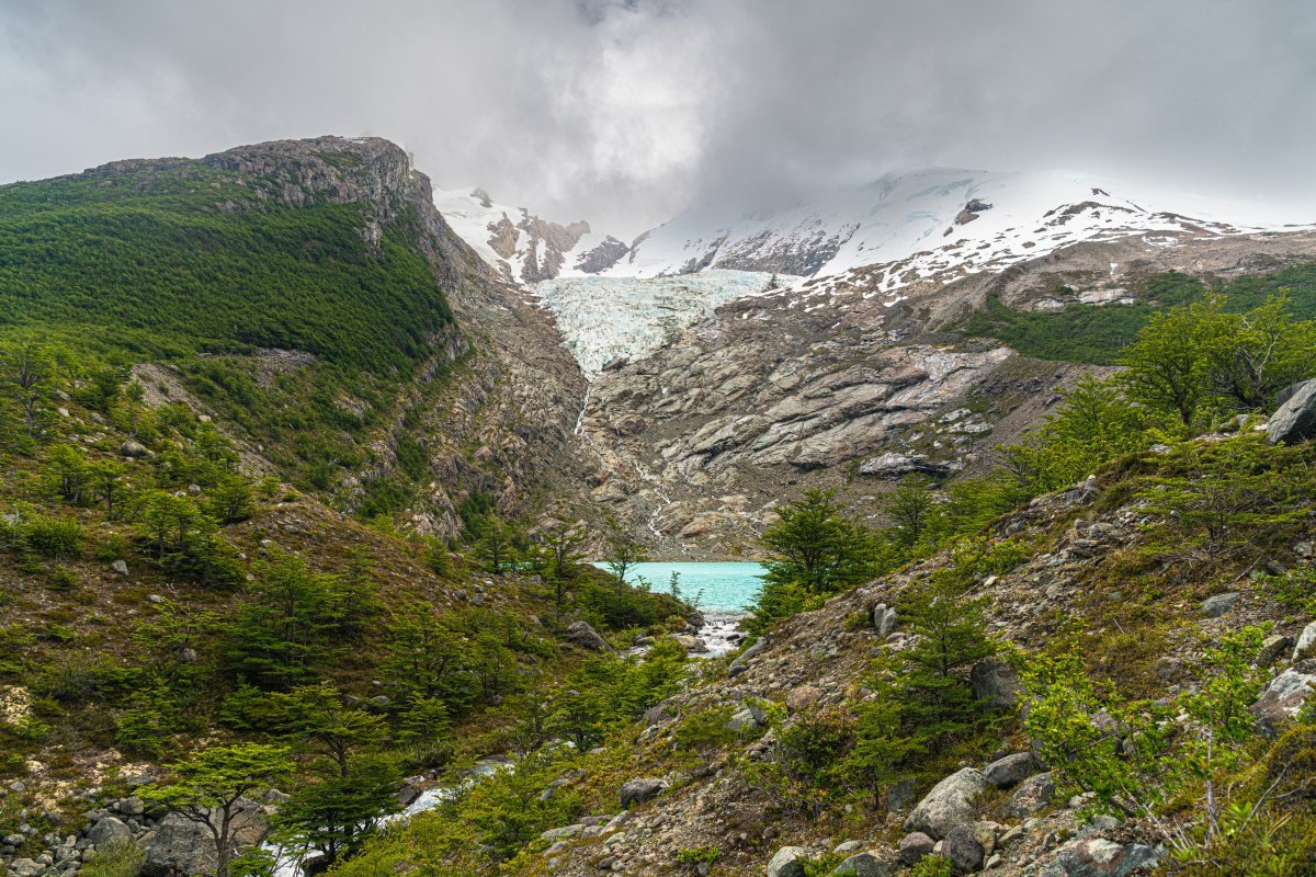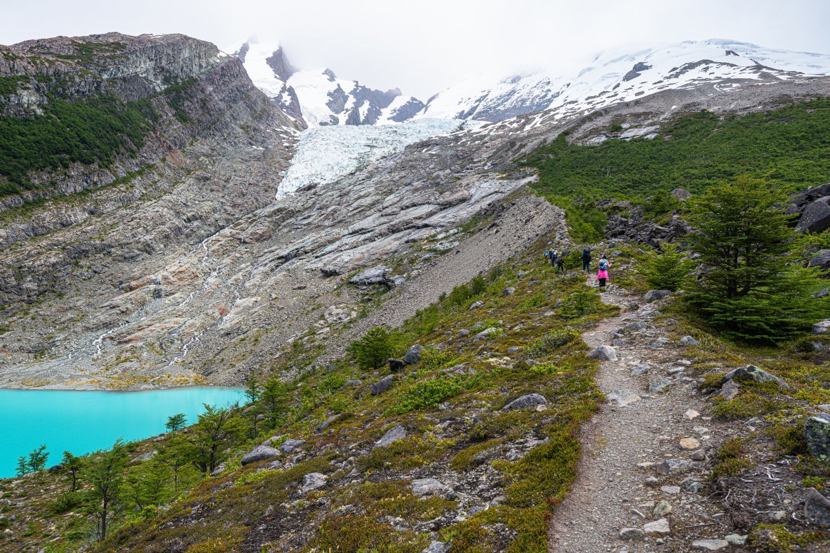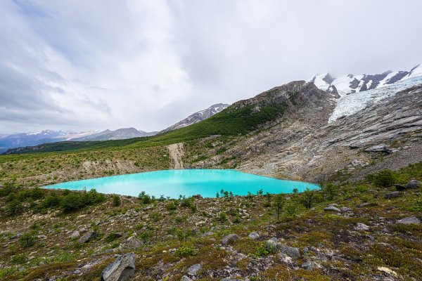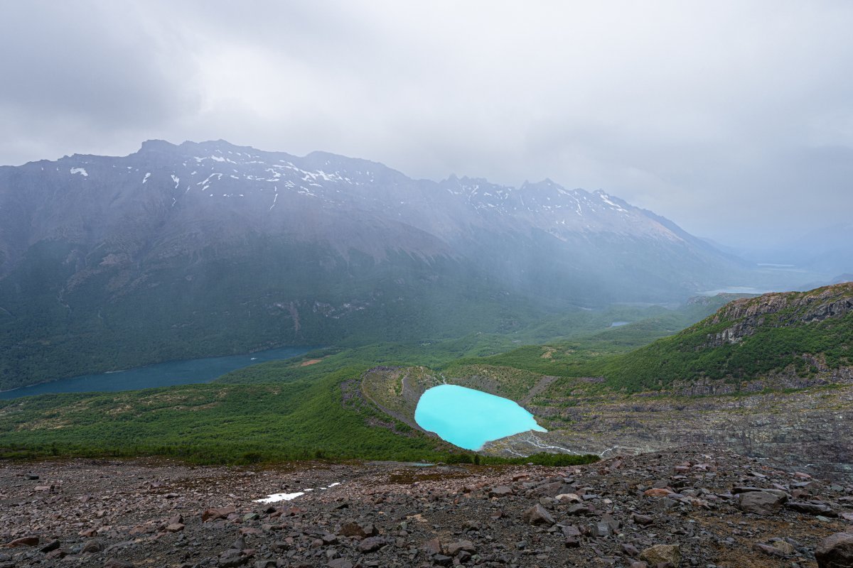 Мы уже почти добрались до ледника - вот он: Но: во-первых, поднялся какой-то совершенно недружественный ветер: Периодически задувало так, что мы физически не могли идти - стояли, упёршись палками в грунт, и ждали окончания порывов ветра... А во-вторых, периодически начал лить дождь. Что-то мне совершенно не захотелось продолжать лезть на этот ледник поскольку: 1) ледники надо смотреть в солнечную погоду! - только так можно увидеть их "в полный рост", сверкающие голубым льдом и отражёнными солнечнымы лучами; 2) в такую погодку это не вполне безопасно (даже под руководством опытных гидов); и 3) да что я ледников не видел что-ли ни разу? И на Алтае, и на Кавказе, и на Аляске, и в Гренландии, и в горах Тянь-Шаня, и в Антарктиде, и в Новой Зеландии - а может и где ещё. Так что мы посовещались - и частично развернулись обратно. Кто-то всё же полез к леднику (успешно), кто-то решил вернуться обратно.. Прощальный взгляд на ледник: - и вних к озеру, просто посидеть и посозерцать его красоту:1 балл