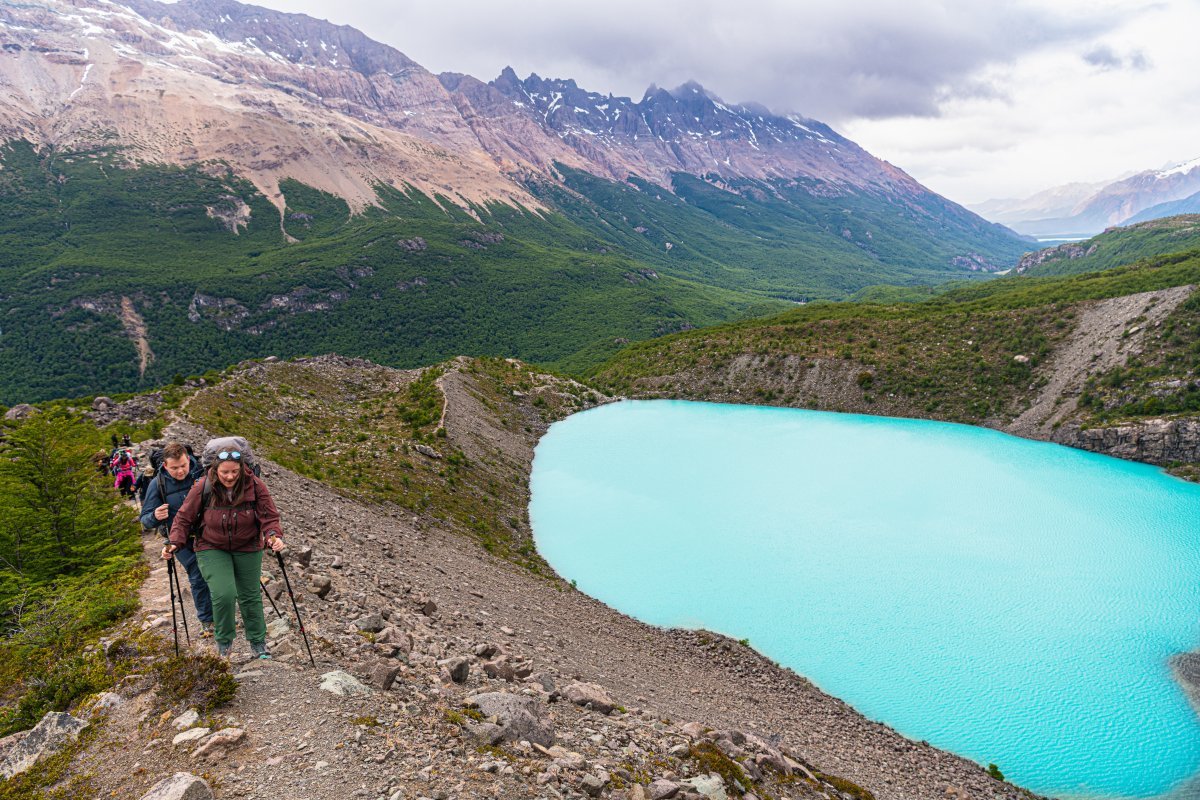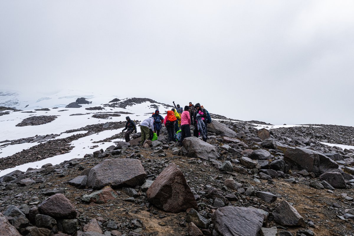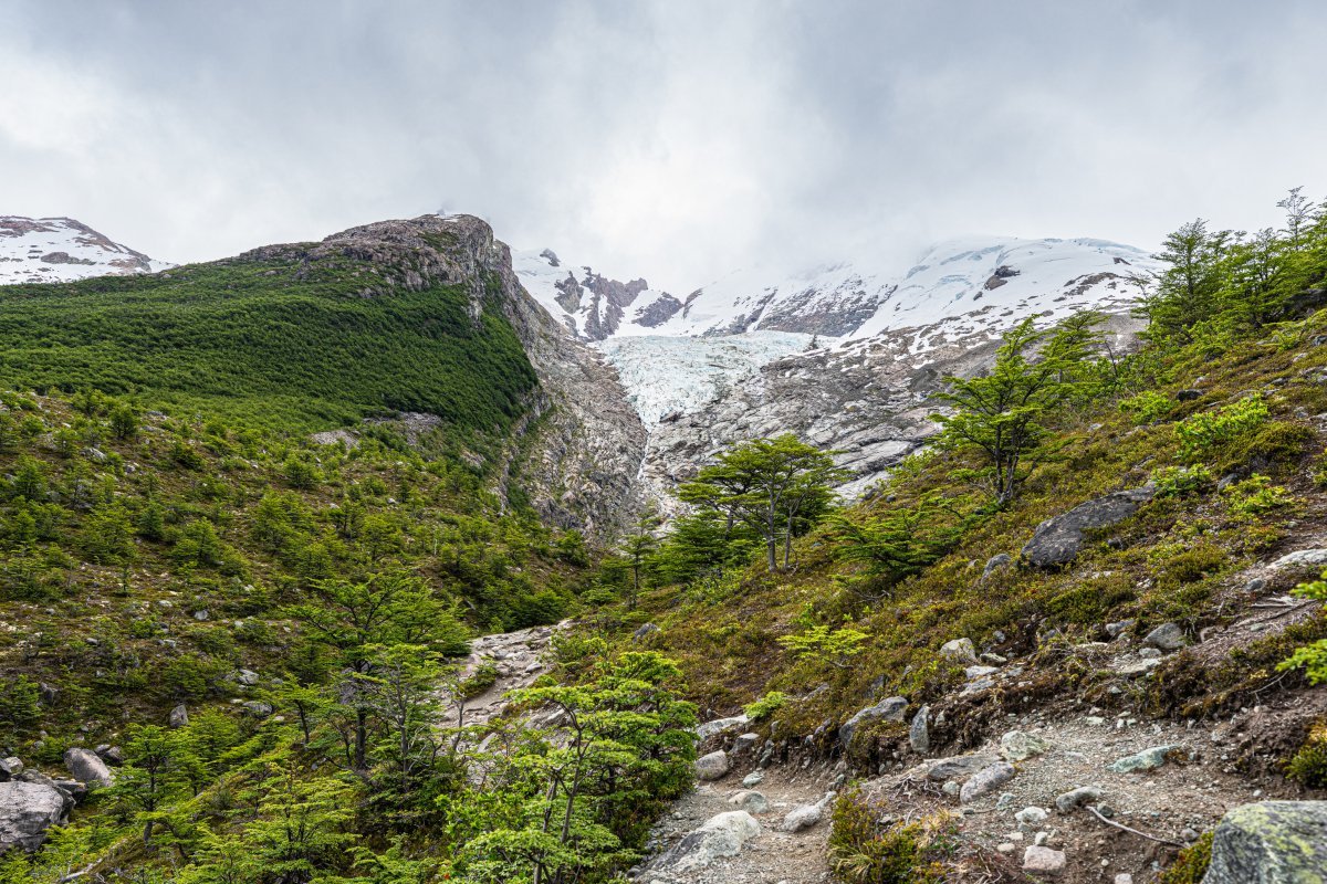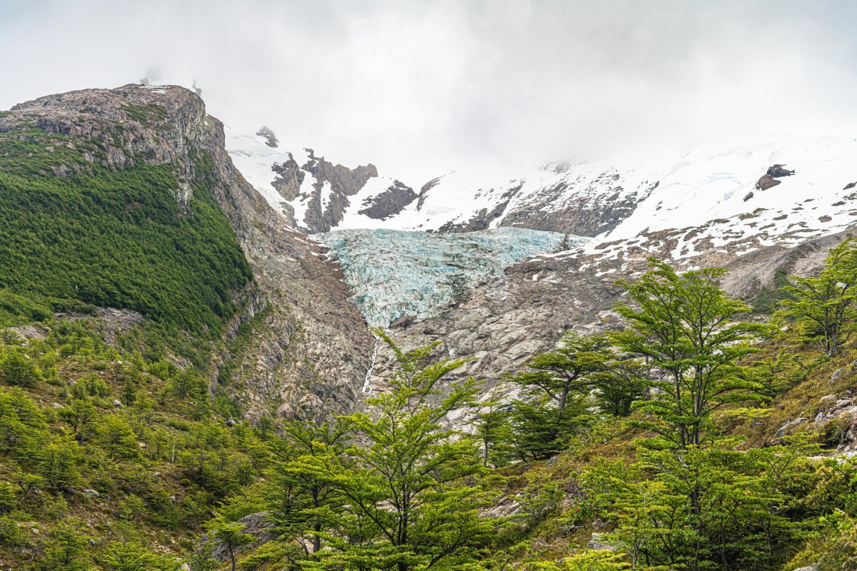 Мы уже почти добрались до ледника - вот он: Но: во-первых, поднялся какой-то совершенно недружественный ветер: Периодически задувало так, что мы физически не могли идти - стояли, упёршись палками в грунт, и ждали окончания порывов ветра... А во-вторых, периодически начал лить дождь. Что-то мне совершенно не захотелось продолжать лезть на этот ледник поскольку: 1) ледники надо смотреть в солнечную погоду! - только так можно увидеть их "в полный рост", сверкающие голубым льдом и отражёнными солнечнымы лучами; 2) в такую погодку это не вполне безопасно (даже под руководством опытных гидов); и 3) да что я ледников не видел что-ли ни разу? И на Алтае, и на Кавказе, и на Аляске, и в Гренландии, и в горах Тянь-Шаня, и в Антарктиде, и в Новой Зеландии - а может и где ещё. Так что мы посовещались - и частично развернулись обратно. Кто-то всё же полез к леднику (успешно), кто-то решил вернуться обратно.. Прощальный взгляд на ледник: - и вних к озеру, просто посидеть и посозерцать его красоту:1 балл