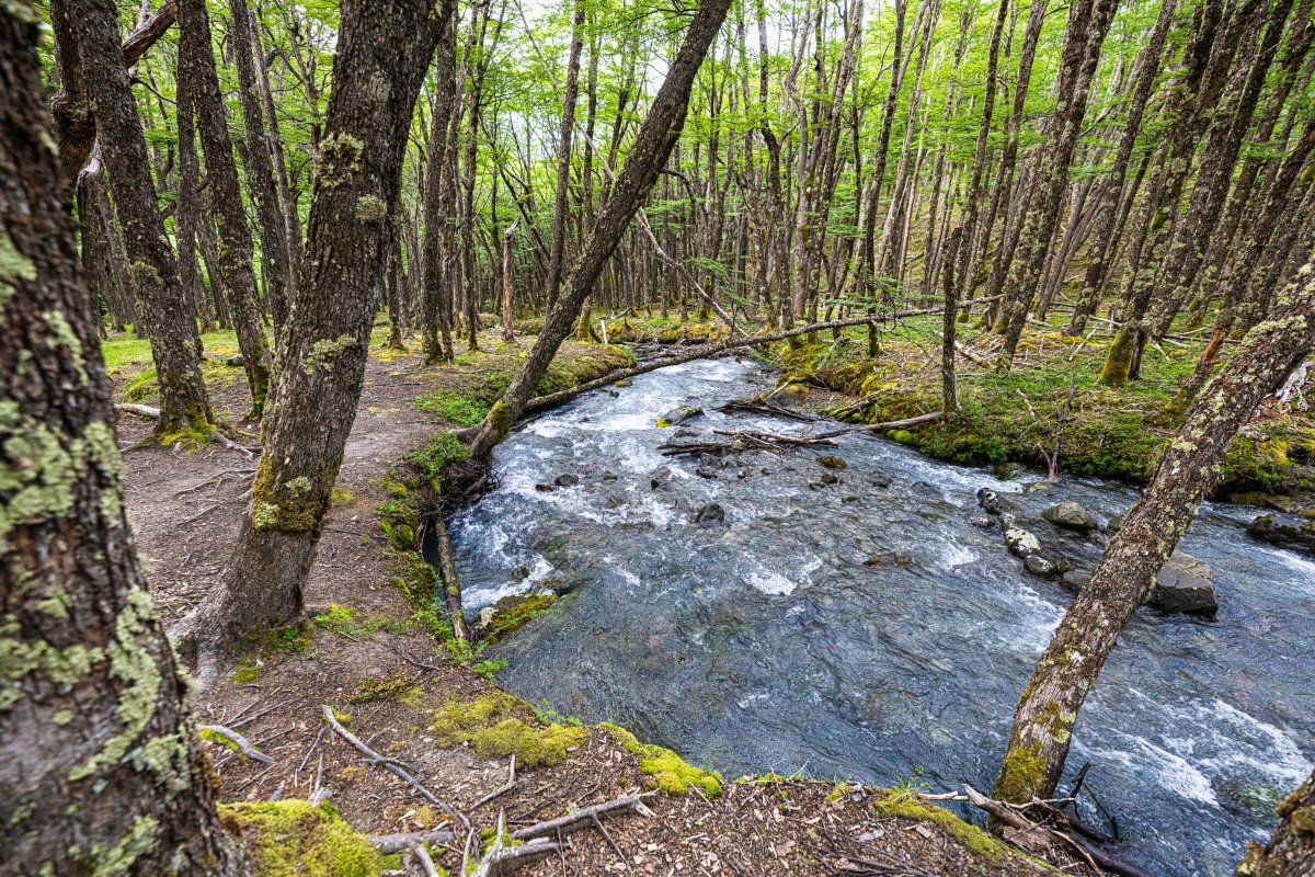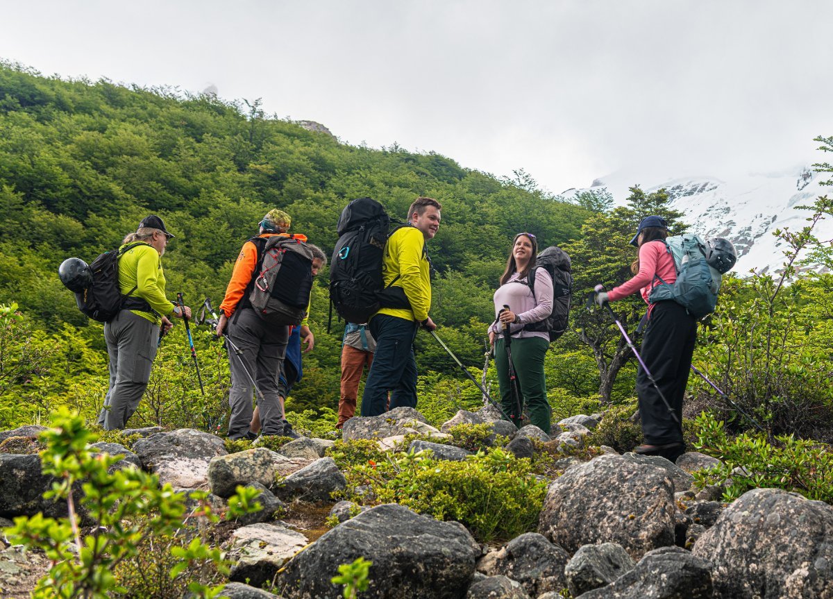Кошки-каски примерили, рюкзаки поправили - пошли! И сначала всё было вполне комфортно. Дорожка ровная, погода ласковая и тёплая, дождик не капает (хоть и тучки на небе). Плюс весьма симпатичный лес вокруг показывают, да плюс ручей славный такой рядом журчит: Просто хоть обфотографируйся! Народ бодрый, улыбается: - и бодро топает вверх к озеру, леднику и потрясающим видам. Кстати, обратите внимание как и во что мы одеты. Это уже потом мы надели на себя всё что было... То есть, в начале пути всё было просто замечательно (кроме какой-то совершенно лишней облачности) -1 балл