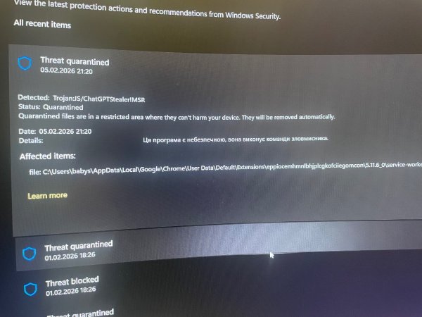 1. Удалил антивирус 360 security. 2. Захожу в антивирус винды (чтобы восстановить нужный мне файл) -журнал защиты и хочу восстановить один файл, в итоге там появляется непонятный файл и антивирус сам закрывается. 3. Провел полное сканирование с помощью dr web cureit и обнаружились угрозы, переместились в карантин. После этого всего всеравно антивирус закрывается как на видео. Прилагаю еще скриншот с двумя непонятными программами которые установлены на пк. у меня виндовс 10 на пк https://www.youtube.com/watch?v=j5aPu8TweZI CollectionLog-2026.01.14-20.08.zip Архив ZIP - WinRAR.zip
