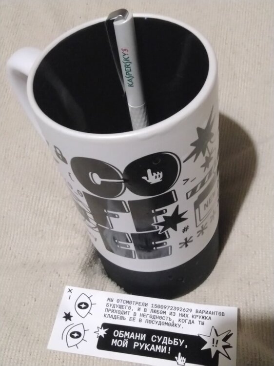 В данной теме представлен обзор с подробным описанием подарочного сувенира, который получен из магазина клуба по бонусной программе, за форумное бета-тестирование, из Магазина «kaspersky<merch» и т. п. Пожалуйста, не обсуждайте в этой теме другие сувениры. . . Кружка для дрип-кофе Из описания с "kaspersky<merch" Эта кружка идеально подойдет для заваривания кофе в дрип-пакетах Объем кружки – 470 мл Снизу кружки силиконовая вставка, чтобы не допустить падений и утечек. Высота: 14,8 см, диаметр: 8,3 см Вес: 0.563 кг Важно – кружку нельзя мыть в посудомоечной машине. Фотографии с "kaspersky<merch" Фотографии мои На последнем фото, я для наглядности глубины положил ручку, линейки не нашлось Кружечка на мой взгляд увесистая. Благодаря силиконовой ставки, не ударяется об стол, ставится без звучно.