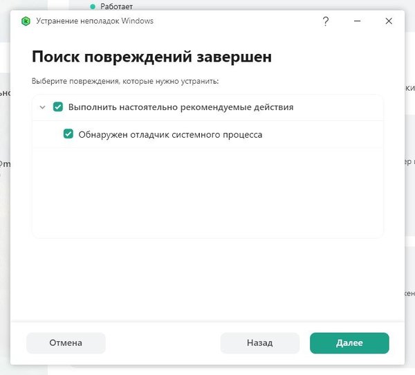 1. Запустила в антивирусе функцию "Устранение неполадок Windows" (просто так, проблем никаких не было), а она выдала такое: В описании говорится, что это может быть из-за вирусов, но у меня их нет. Тогда запустила скрипт сбора информации в AVZ 5, в отчете, по поводу этого отладчика есть такая строчка: vdsldr.exe - это загрузчик службы виртуального диска. Проверила, на всякий случай, его на Вирустотале - полностью чистый. В общем, не понятно, применять или не применять это исправление в антивирусе. Вроде, рекомендуется применить, но вдруг нарушится работа службы виртуальных дисков, а она отвечает за управление всеми дисками (не только виртуальными).