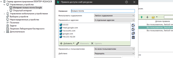 1. Здравствуйте! У меня задача заблокировать весь интернет кроме Google почты, в Консоли Касперском в Веб-контроль создал 2 правило, первое запрещало любой интернет а второе разрешало зайти на поисковик Google.com и на почту mail.google.com В итоге завожу почту потом пароль, после ввода пароля не чего не происходит, при этом все заблокировано кроме поисковика google.com и почты mail.google.com (но на почту не входит) После всего этого решил по пробовать через создания профиля политики и назначения на компьютер через тег, там в веб-контроле прописал тоже самое а профиль через тег не сработал и интернет не заблокировал, хотя принудительно на компьютер назначил. Все это происходило в отдельной группе для теста на компьютере.