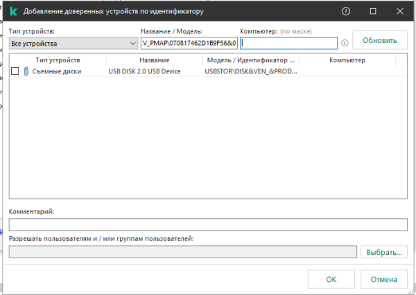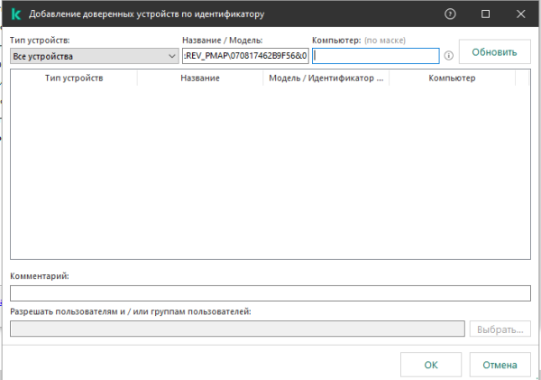 Добрый день! Уже мучаюсь вторую неделю, может кто нибудь по пунктам помочь и объяснить. Есть политика, начал добавлять доверенные устройства, бывает вставлю флешку - ввожу ее индификатор- он находит ее при нажатии кнопки Обновить. Затем бывает вставлю флешку другую- нажимаю обновить- и все поле пустое ,хотя флешка вставлена. А у меня таких флешок 100 и из них уже 3 вот так не определились, пытался и серийный номер вставлять и звездочками с двух сторон-всеравно пустое поле. И даже когда выюираю имя компьютера и нажимаю обновить- он показывает оборудование этого компьютера, но без этой флешки. -