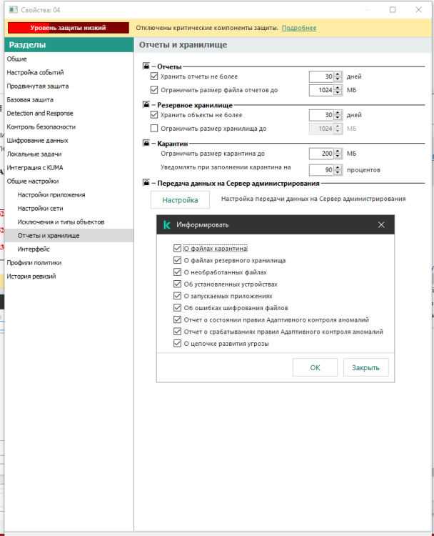 Добрый день! Подскажите, есть ли возможность защитить KES от выключения пользователем в AstraLinux паролем? Знаю, что есть такая возможность на windows, но в политиках для KES Linux на KSC пункт "интерфейс" - > самозащита и т.д. отсутствует. Поиск в манах результата не дал (возможно плохо искал). Использую KES 12.0 для AstraLinux под управлением KSC 14.2 (web-консоль). Сообщение от модератора thyrex Перемещено из технического раздела