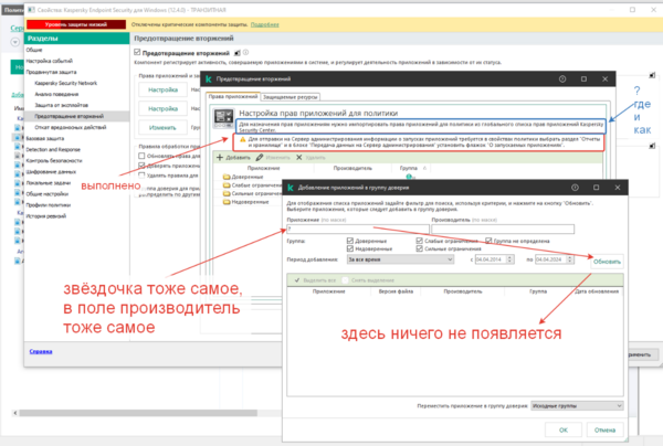 Доброго дня всем. Попробовал своими силами, не удалось. До запроса в ТП решил тут спросить, у более опытных и знающих продукт. Система KSC 14.2.0.26967 установлена на Windows Server 2012R2 (ВМ), на клиентах KES 12.4.0.467. Управление системой ведётся из MMC консоли с админской машины. Kaspersky для нас система новая, вынужденно пересели с Eset Endpoint. В фокусе настройка связанных модулей "Предотвращение вторжений" и "Сетевой экран". Первоначальная сортировка приложений отработала, и нужные сотрудникам программы попали в группу "Слабые ограничения", в связи с чем остановились службы и вообще работа у людей встала. Для нас это не было сюрпризом и люди были предупреждены, что мы сначала соберём данные, а потом централизованно настроим список доверенных приложений в указанных модулях. KSN отключена, не используем и не собираемся. Согласно документации от 13 февраля 2024 г. (https://support.kaspersky.com/KESWin/12.4/ru-RU/123280.htm), я иду настраивать политику нужной мне группы. Политика не дефолтная, наследование отключено. Выбираю модуль "Предотвращение вторжений" в блоке Продвинутая защита, жму настройка, добавить. Ввожу маску * и жму обновить. Приложения не появляются. Меняю маску на ? - тоже самое. В поле производитель пробую вводить и маски, и вендоров - ничего не меняется. Тоже самое в модуле сетевой экран. Т.е. централизованно сортировать нечего. Снимаю в политике замки и иду в настройки модулей в интерфейсе самого KES, а там всё видно. Можно перетаскивать приложения из одной группы в другую и настраивать сетевую активность. Хотел посмотреть как дела в web-консоли, но даже до настройки не добрался, т.к. вебка сообщает об отсутствии поддержки для указанной версии. Галка в отчётах "отправлять на сервер данные о запускаемых приложениях" стоит, реестр программ заполнен. Может я что-то ещё упустил в этом адском комбайне? Например, один момент остался непонятым где это и как. На приложенном скриншоте момент обозначил синим цветом. Пока временно оба модуля пришлось отключить, сотрудники работу возобновили. Но это же не решение проблемы. -