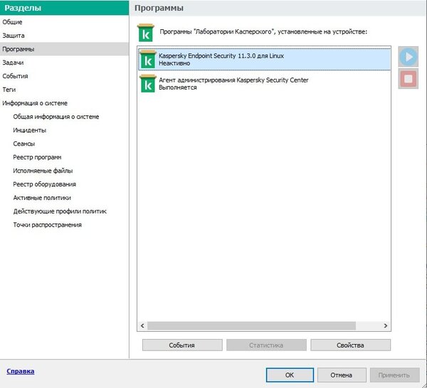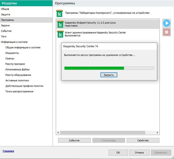 Добрый день! Прошу подсказать, возможно у кого были подобные проблемы, но суть такая, имеется Kaspersky Security Center версии 14.2.0.26967, работающий под ОС Windows Server 2019, имеются управляемые устройства под ОС Linux (Ubuntu), на которые установлены и агенты администрирования и сами компоненты защиты Kaspersky endpoint security 12 for linux, версии 12.0.0.6672, агенты администрирования версии 15.0.0.12912. Агенты администрирования доступны и синхронизируются с KSC, подключение происходит, но вот сама суть проблемы в том, что на устройствах при выключенных компонентах защиты, допустим через тот же KSC, не получается запустить их обратно, то есть в разделе устройства "Программы" при попытке запустить компонент защиты, KSC очень долго думает, останавливая процесс в одном положении (скрин ниже) и после продолжительного времени, он сообщает о ошибке запуска, хотя повторюсь, остановить защиту удалось на этом же хосте ,но вот запустить нет, и агент администрирования также работает и синхронизируется. Проблема в целом не на одном хосте, она массовая, в целом устройства не удается таким образом удаленно запустить компоненты защиты, может кто сталкивался и понимает хотя бы в каком направлении изучать проблему ? Возможно KSC сам какие-либо патчи нужны или еще что, с точки зрения сети устройства в одной подсети, и в tcpdump трафика вижу общение по 13000 порту успешно. Прикладываю скриншот проблемы, когда нажимаю запуск и в каком положение останавливается. К слову пробовал через задачи и запускал "Запуск и остановка программы" результат по сути тот же, только там она просто висит в процессе и всё. -