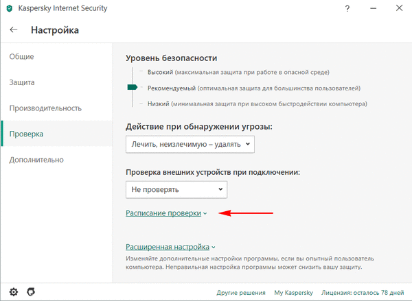 Обновился на KIS21 и не могу понять, где настройка проверки по расписанию? В интерфейсе KIS20 это было здесь, показано стрелочкой. А в KIS21 здесь пустое место... ?