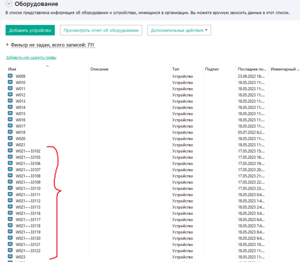 Добрый день. Возникла следующая проблема: Раньше был комп в AD и KSC с именем W021 на винде. Который успешно удалили и через пару лет добавляем в KSC новое устройство W021 на линуксе, установив предварительно на него агент и KSE. Новый комп определяется и работает хорошо, НО в базу постоянно добавляется старое устройство W021~(....) с тегом через тильду, и каждый раз тег меняется и устройство бесконечно добавляется заново. В AD видится только один комп на линуксе. Пробовали вариант поставить галку "списать оборудование", имеющее теги. Удаляли устройство W021 и windows и linux. Все равно "Обнаружено устройство W021~(....)" По какому принципу он дублирует устройство, как остановить это и вычистить старое, если оно где-то есть?