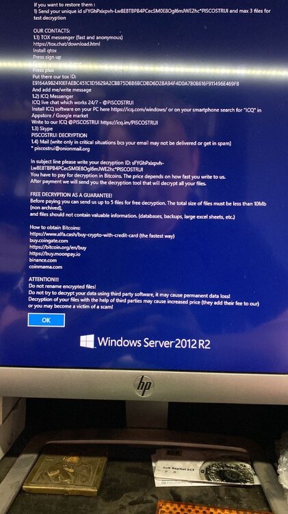 2. Добрый день. Вышло сообщение, текст ниже. Первый раз столкнулся с такой ситуацией, можно его как то расшифровать? Важные данные лежат, 4 виртуалки (1С, SQL). Может кто сталкивался, или бесполезно и все пропало? Не хочется платить вымогателям (да и ценник думаю будет не маленький). ALL YOUR FILES HAVE BEEN ENCRYPTED DUE TO A SECURITY PROBLEM WITH YOUR PC. If you want to restore them : 1) Send your unique id BDpfbw9XEVobf5oSbM6nFUhCuG-weNhoiV9cUfeLAzI*PISCOSTRUI and max 3 files for test decryption OUR CONTACTS: 1.1) TOX messenger (fast and anonymous) https://tox.chat/download.html Install qtox Press sign up Create your own name Press plus Put there our tox ID: E9164A982410EFAEBC451C1D5629A2CBB75DBB6BCDBD6D2BA94F4D0A7B0B616F911496E469FB And add me/write message 1.2) ICQ Messenger ICQ live chat which works 24/7 - @PISCOSTRUI Install ICQ software on your PC here https://icq.com/windows/ or on your smartphone search for "ICQ" in Appstore / Google market Write to our ICQ @PISCOSTRUI https://icq.im/PISCOSTRUI 1.3) Skype PISCOSTRUI DECRYPTION 1.4) Mail (write only in critical situations bcs your email may not be delivered or get in spam) * piscostrui@onionmail.org In subject line please write your decryption ID: BDpfbw9XEVobf5oSbM6nFUhCuG-weNhoiV9cUfeLAzI*PISCOSTRUI You have to pay for decryption in Bitcoins. The price depends on how fast you write to us. After payment we will send you the decryption tool that will decrypt all your files. FREE DECRYPTION AS A GUARANTEE! Before paying you can send us up to 5 files for free decryption. The total size of files must be less than 10Mb (non archived), and files should not contain valuable information. (databases, backups, large excel sheets, etc.) How to obtain Bitcoins: https://www.alfa.cash/buy-crypto-with-credit-card (the fastest way) buy.coingate.com https://bitcoin.org/en/buy https://buy.moonpay.io binance.com coinmama.com