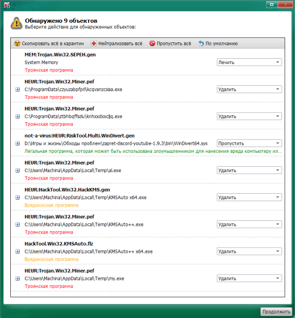 1. После баловства с kms auto остались вирусы. Сделал первые два скрипта в https://www.cyberforum.ru/viruses/thread3216102.html в безопасном режиме. Потом решил, что лучше обратится в форум. Сделал по инструкции проверку Kaspersky Virus Removal Tool. Он вывел: Пропустил только одно (то что зеленым подписано), был в нем уверен. Нажал продолжить и он ВРОДЕ БЫ вылечил. После, запустил ещё раз полную проверку. В AVZ потом обновил базы и тоже сделал полную. Они сказали что вирусов нету. Прошлые точки восстановления снёс, создал новые. Я правильно все сделал? Хотелось бы убедиться, что все вирусы были удалены. Логи: CollectionLog-2026.01.30-16.43.zip
