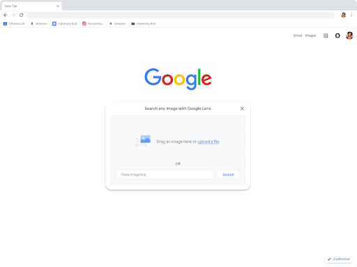 • На страницу, показываемую при открытии новой вкладки, в поисковую строку добавлена пиктограмма с камерой для поиска по изображению при помощи сервиса Google Lens. Изображение для поиска может быть указано как в форме URL, так и в виде локального файла.
