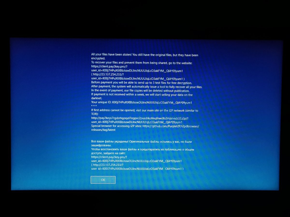 pay2key На синем экране ноутбука следующая надпись: Ваши файлы украдены! Оригинальные файлы остались у вас, но были зашифрованы...
