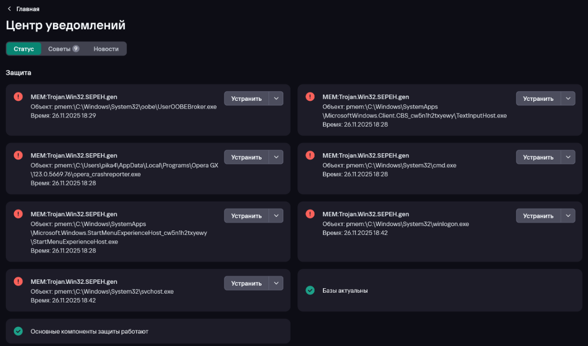 Появился MEM:Trojan.Win32.SEPEH.gen на компьютере. Пробовали использовать KES 11.3 (расширенный) - не вылечил. Использовали KVRT - нашёл, но не вылечил. Пробовали утилиту Dr. Web - даже не нашёл. Расположение файла не получается найти, просто в системной памяти.