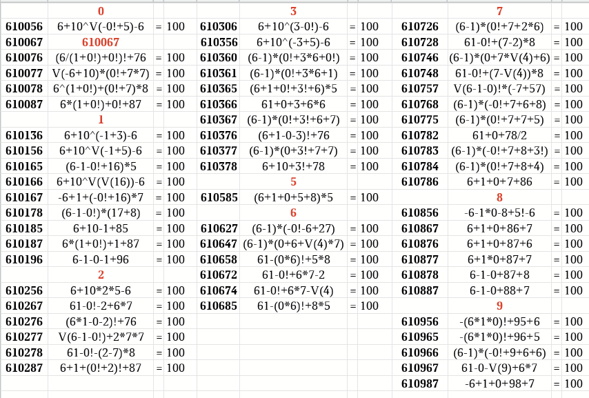 E.K. Опубликовано 27 января Автор Опубликовано 27 января 601 - "трёхзнаков" не вижу.. Идём по "4-знаки + 2-знаки". 6010 <= "6011" 6011 (6+0!)*(1+1) = 10, 601-1 = 600 not "02,06,10" =6 штук. 6012 (6-0!)*1*2=10, 60/(1+2) = 20, (6-0!)!-12 = 108 not "02,05,08,10" =10. 6013 <= "6016" 6014 6+0*1+4=10, 60/(-1+4) = 20, (6-1)!-14 = 106 not "02,05,06,10" =6. 6015 6-0-1+5 = 10, -6*(0!+1)+5! = 108, (6+0!)*15 = 105 not "02,05,08,10" =10. 6016 6-0!-1+6 = 10, 60+(-1+6)*"08" = 100 not "02,08,10" =18. 6017 6/(0!+1)+7 = 10, (6-0!)!-17 = 103, 6+(0!+1)*7 = 20 not "02,03,05,10" =12. 6018 6+0!+V(1+8) = 10, (6+0)*18 = 108, 60*1+8*"05" = 100 not "02,05,08,10" =10. 6019 <= "6013" Что-то многовато = 85 72 комбинации... Никак оптимизнуть не получится? 601156 601536 601606 601836 601167 601556 601627 601856 601176 601565 601636 601865 601177 601566 601647 601866 601178 601567 601656 601867 601187 601576 601658 601876 601577 601660 601877 601236 601578 601661 601878 601256 601585 601665 601885 601265 601596 601666 601896 601266 601667 601267 601707 601672 601276 601717 601674 601277 601756 601676 601278 601765 601677 601285 601766 601678 601296 601767 601685 601770 601696 601456 601771 601467 601776 601476 601777 601477 601778 601478 601787 601487