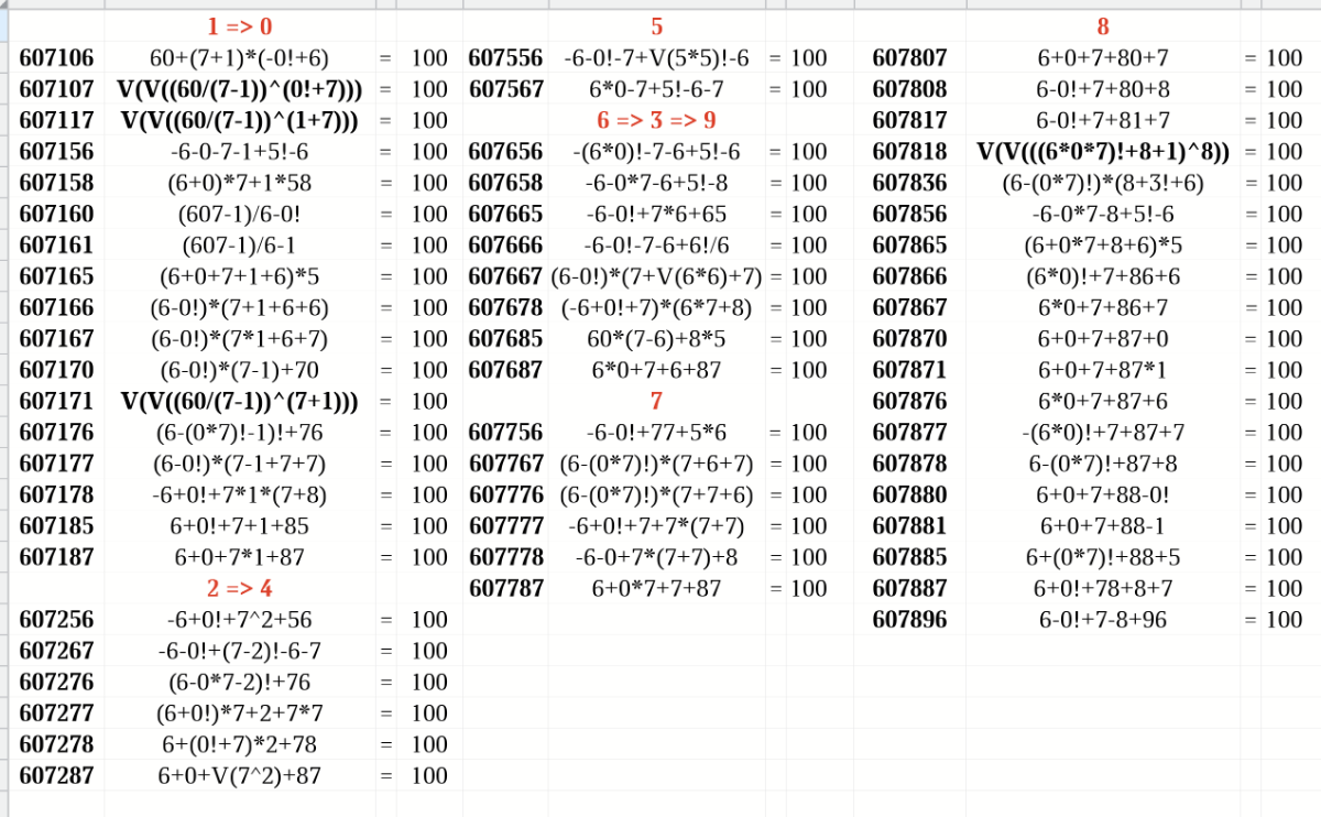 E.K. Опубликовано 28 января Автор Опубликовано 28 января 607 - следующая. 6!/(0!+7) = 90 not "010" - многовато будет.. Других полезных выражений не вижу. Ну, по традиции: 6070 <= "6071" 6071 60/(7-1) = 10, 6!/(0!+7)+1 = 91 not "02,09,10" =17. 6072 6-0!+7-2 = 10, (6-0!)!-7*2 = 106, 6*(0!+7^2) = 300 not "02,03,06,10" =6. 6073 <= "6076" 6074 <= "6021" 6075 6-(0*7)!+5 = 10, -6 +/-/* 0!-7+5! = 106,107,108 not "02,06,07,08,10" =2. 6076 60+7*6 = 102, 6!/(0!+7!/6!) = 90, (6-0!)!-7-6 = 107, (6+0!)*(7+6) = 91 not "02,07,09,10" =8. 6077 607-7 = 600, 60+7*7 = 109, (6+0!)*(7+7) = 98, 6!/V((0!+7)*8) = 90 not "02,06,09,10" =6. // "09" не требуется. 6078 -6+0!+7+8 = 10, (6-0!)!-7-8 = 105 not "02,05,10" =19. 6079 <= "6073" Всего = 58. 607106 607556 607807 607107 607567 607808 607117 607817 607156 607656 607818 607158 607658 607836 607160 607665 607856 607161 607666 607865 607165 607667 607866 607166 607678 607867 607167 607685 607870 607170 607687 607871 607171 607876 607176 607756 607877 607177 607767 607878 607178 607776 607880 607185 607777 607881 607187 607778 607885 607787 607887 607256 607896 607267 607276 607277 607278 607287