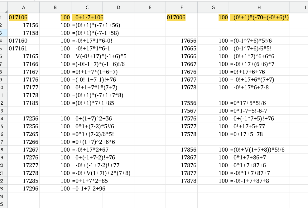 0178    0!+1^7+8 = 10, (0!+1)*(7*8-"06") = 100                                               not "02,06,08,10" = 6.
