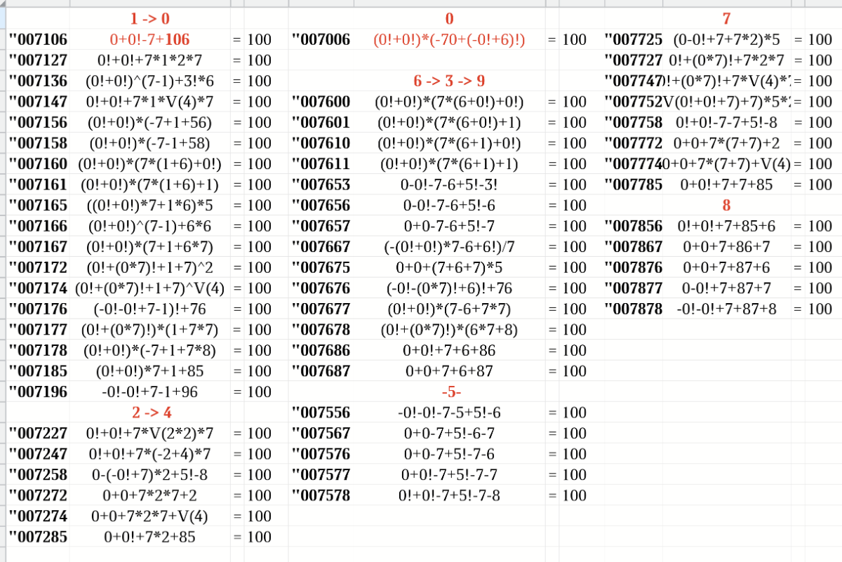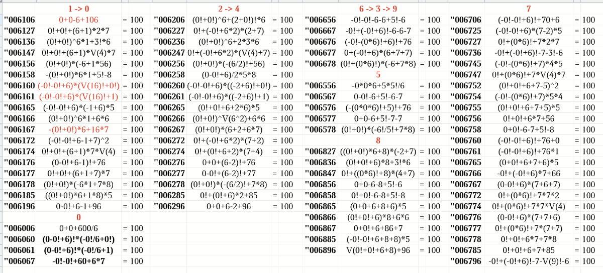-0!+V(0!+7!)+6+"04"! = 100