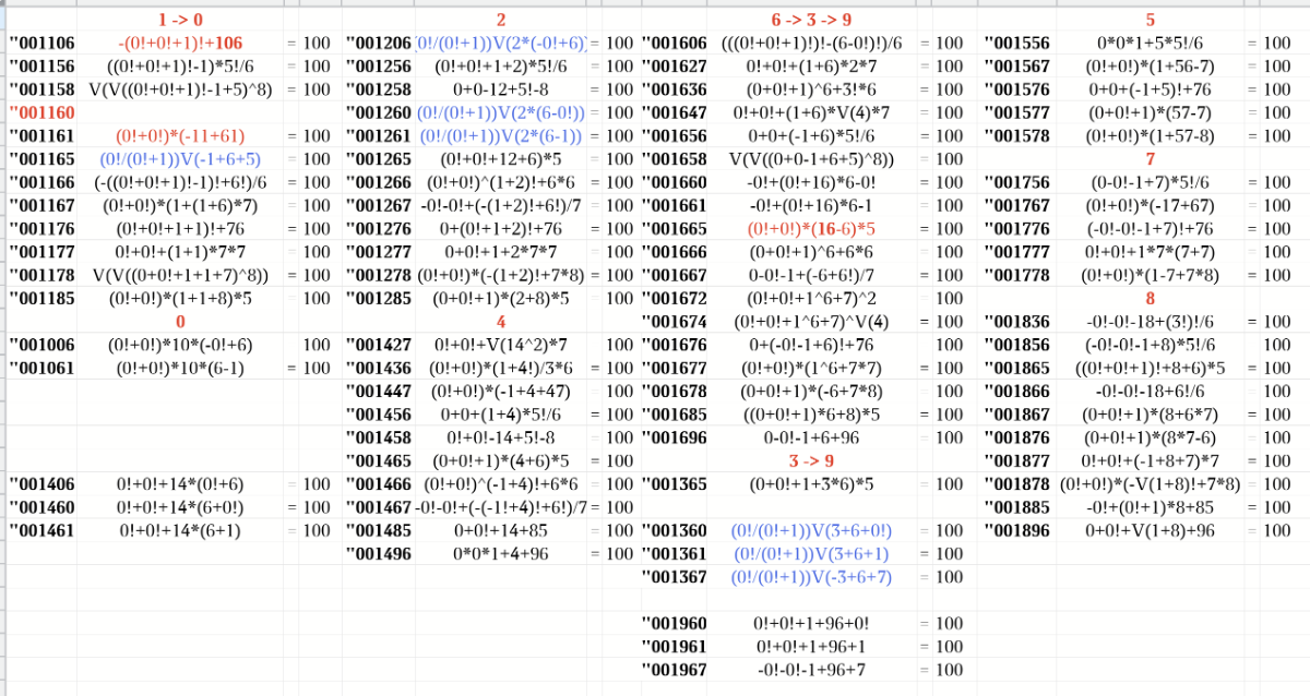 Поскольку ни одной неразрешимой комбинации "123456=100" с ненулевым первым символом обнаружено не было, то предлагаю продолжить с нулями. Их 31 штука (если без двойного нуля в начале).