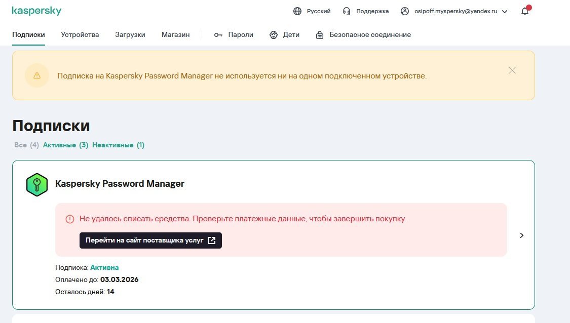 Bercolitt Опубликовано Воскресенье в 23:51 Автор Опубликовано Воскресенье в 23:51 В 28.02.2026 в 09:57, andrew75 сказал: У вас же KPM привязан к личному кабинету MyKaspersky. В 16.06.2025 в 13:25, Bercolitt сказал: Техподдержка перенесла данные о лицензии KPM в мой текущий аккаунт My Kaspersky. https://forum.kasperskyclub.ru/topic/467903-propala-podpiska-kaspersky-password-manager/?&_rid=36475#findComment-2226209 Так в чем проблема зайти в этот личный кабинет и продлить лицензию оттуда? Техподдержка пока не может решить эту проблему, а я тем более. В My Kaspersky весит постоянно сообщение: "Подписка на Kaspersky Password Manager не используется ни на одном подключенном устройстве". Есть работающая коммерческая подписка KPM(явно не бесплатная) с 38 записями . Это называется, не верь своим глазам. Теперь надо как-то заблокировать продление лицензии KPM, чтобы деньги не списались со счета и не оказалось, что у меня куплены 2 лицензии вместо одной на один ПК.