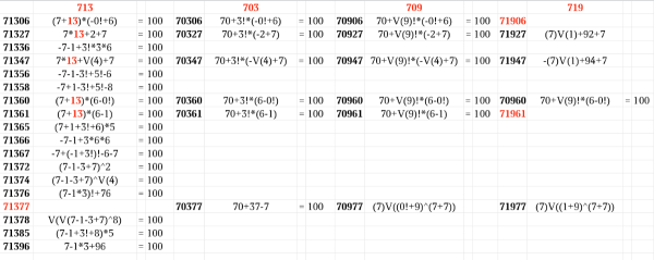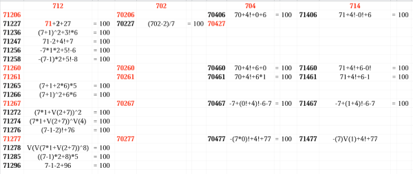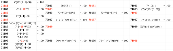 Закончился наш марафон "123456=100", закончился мой заезд по сибирским просторам - и что-то как-то скучно стало. Но глядя на "0xx" подумалось, а нельзя ли оттуда протянуть решение для пятизнаков "12345=100"? Однако, там довольно часто встречается первый 0! - то есть, "напрямую" неполучится. Но подглядывать можно!